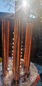 Spiralen om de kristallen: probeer dit maar eens. Neem een mooie punt Bergkristal in je hand en voel de energie. Draai wat koperdraad om een buisje tot een spiraal en plaats diezelfde bergkristal in de spiraal en voel opnieuw. De energie is 4 x zo sterk geworden. Tel uit je winst, om elke dubbeleinder in de 6 buitenste buizen zit zo’n spiraal!!!