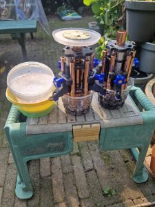 Met nieuwe poets en polijst technieken glimmen de buisjes als Zonnetjes en de Chakra- steentjes zijn van basis tot kruin; Rode Granaat, Oranje Carneool, lichtgele Citrien, Groene Olivijn, ook wel Peridoot, Felblauwe Lapis Lazulli en Purple Amethist. De Basis blijft Brons/Messing met mijn standaard Kristal-Gruis wat zich steeds blijft uitbreiden. Deze Basis geeft ‘s nacht een beetje licht in het donker, wat een effect heeft op absorberen van dag/zonlicht en afgifte hiervan ook in het donker. De Busters worden in het licht gezet in de “Baarmoeder”, een grote Geode van Bergkristal uit de Marokkaanse woestijn, die bij mijn grote Chembuster in mijn tuin ligt. Hiervan is een deel afgebroken en de dubbeleinder Kristalletjes die eraf kwamen krijgen hun plaatsje in de 7 buisjes. Zaaien gebeurt bij Nieuwe Maan en oogsten bij Volle Maan, dit doe ik ook met deze Bustertjes. Daarna komen ze binnen in de grote Amethist-Geode uit Brazilië.